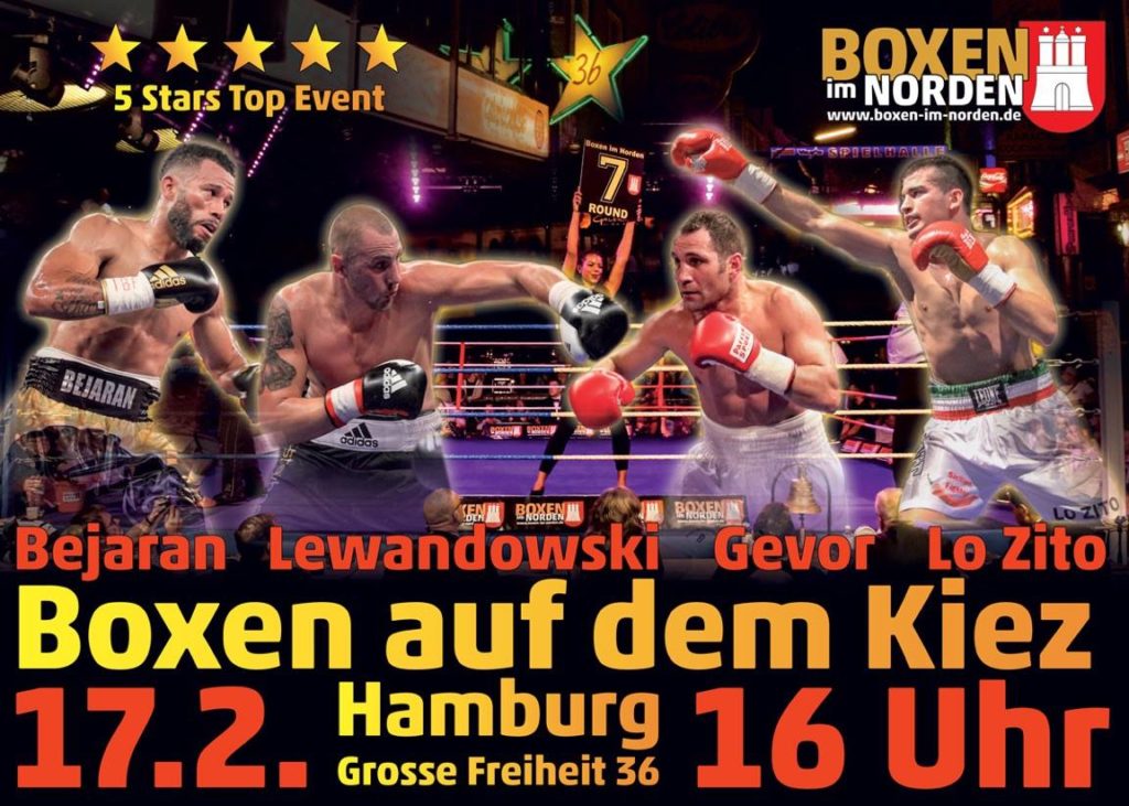 Rafael Bejaran, Khoren Gevor, Christian Lewandowski & Sebastiano Lo Zito in einem Event! Um Titel im Schwergewicht und Supermittel. Grosses Boxen in der Grossen Freiheit: Wie immer mit Live Music Acts und echter Kiez-Stimmung.