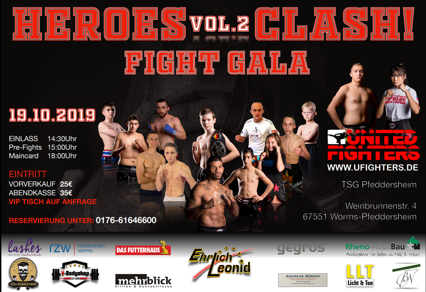 Heroes Clash Vol 2 – Am 19 Oktober 2019 bekommt Worms eine Fight Night der Superlative! Euch erwarten hochklassige Kickboxen, K1 sowie MMA Kämpfe die euch vom Hocker reißen werden.