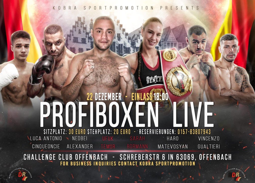 Profiboxen in Offenbach – Internationales Spitzenboxen im Challenge Club Offenbach.Mit dabei die Lokalmatadoren Ufuk Temur, Rahim Rahimi, Luca Antonio Cinqueoncie , Haro Matevosyan und Sarah Bormann, die um die Weltmeisterschaft der Global Boxing Union boxt. Es erwarten sie Profiboxer aus der Ukraine, Ungarn, Chile, Italien, Serbien, Kroatien und weiteren Ländern. Bar und Imbiss sind den ganzen Abend geöffnet.